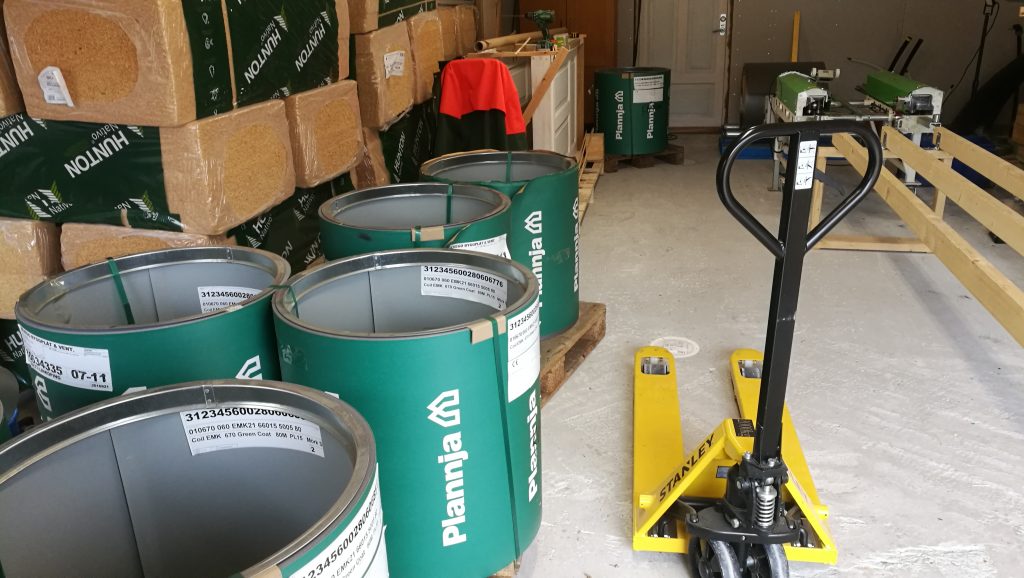 Plåten levereras så ”tunnor” i bakgrunden en plåtmaskin vi köpt in för att bocka plåten och göra högfals samt lågfals