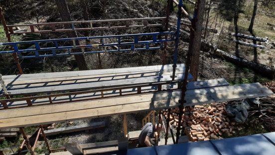 I maj ska muraren komma tillbaka för att mura sista delen av skorstenen. För att säkert komma upp på taket har Uffe byggt en liten speciell byggställning.
